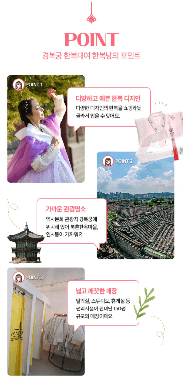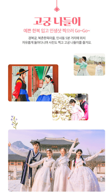 궁 주변에는 다양한 한복 대여소가 있지만 사람이 너무 몰려서 시간이 부족할 수 있다는 리스크가 있습니다.